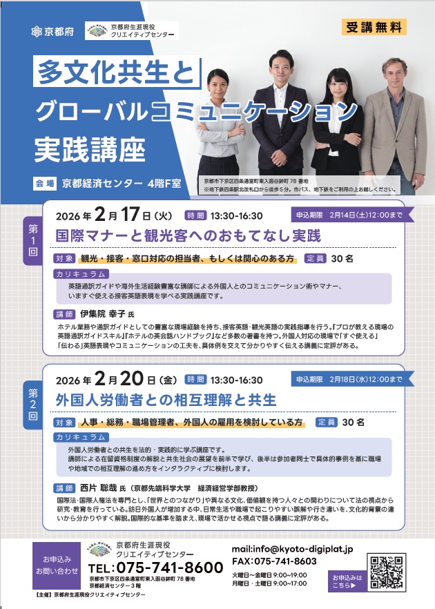 京都府生涯現役クリエイティブセンターでは訪日外国人の増加や外国人労働者の受け入れ拡大に対応する企業の人材育成を支援するため「多文化共生時代の人材育成・職場環境整備のための実践講座」を開催されます。ご興味がございましたぜひご活用ください!