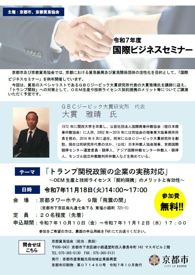 京都市及び京都貿易協会では、京都における貿易振興及び貿易関係団体の活性化を目的として、「国際ビジネスセミナー」を例年開催しています。